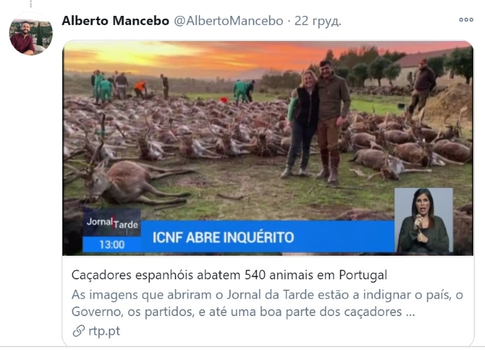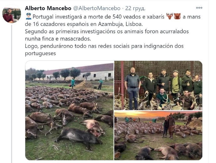 Міністр навколишнього середовища Португалії Жоау Фернандеш заявив, що вбивство тварин, вчинене 16 іспанськими мисливцями, було «мерзенним екологічним злочином», яке повинно переслідуватися за законом.